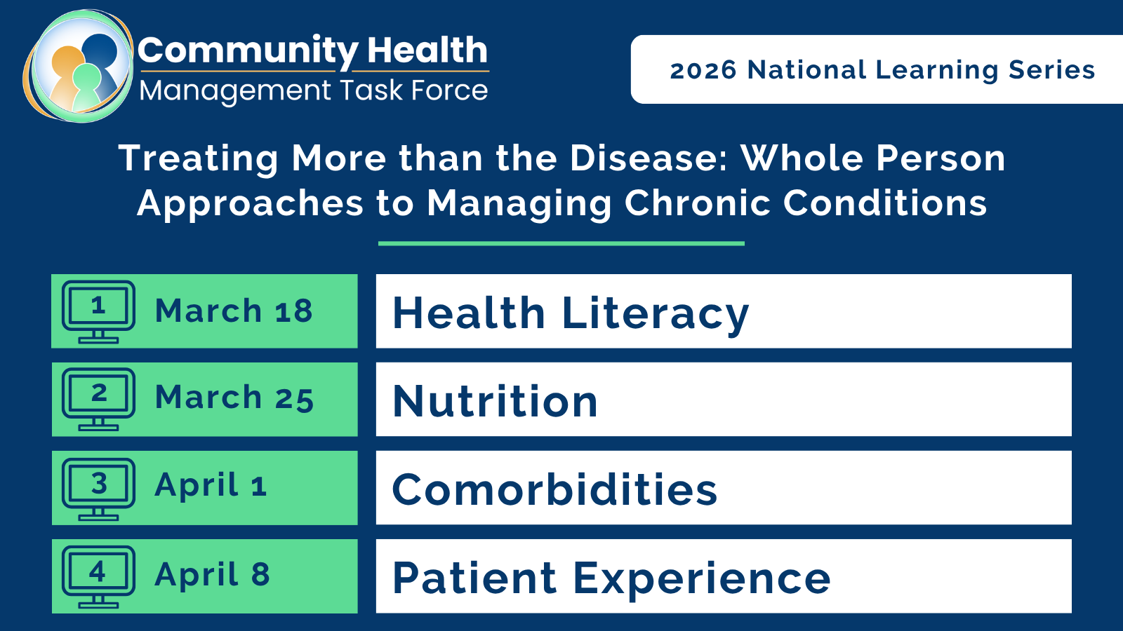 The Community Health Management Task Force, a collaboration of 13 National Training and Technical Assistance Partners, is excited to announce a 4-part National Learning Series. This series of four webinars will highlight promising practices that improve the prevention, treatment, and management of chronic conditions among health center patients through case studies on health literacy, co-occurring morbidities, patient experience, and food as medicine.